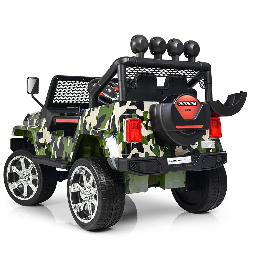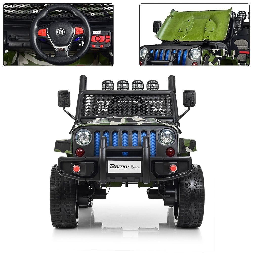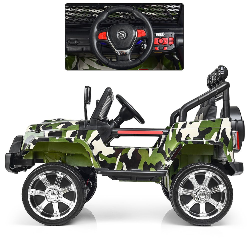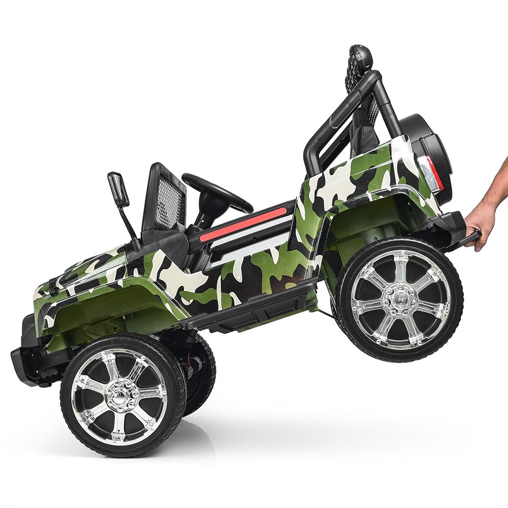 Заводится с ключа, есть функция экстренной остановки на пульте, усиленная рама, усиленное днище, зеркала заднего вида, лобовое стекло, фирменная упаковка, открывается капот, есть багажник в виде колеса.
