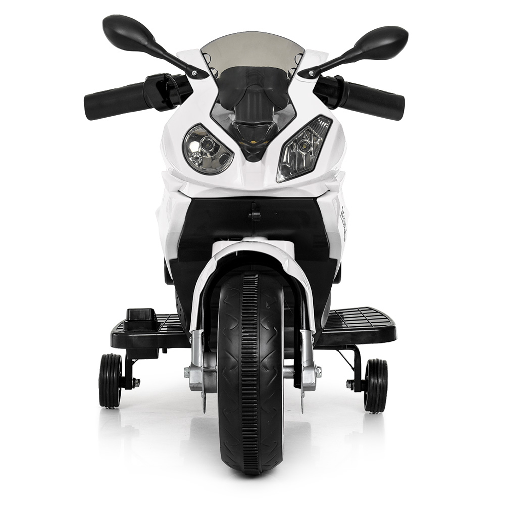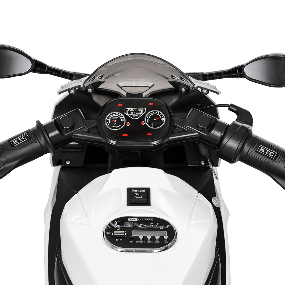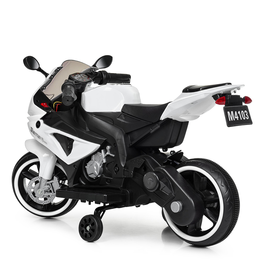 Металлический каркас двигателя (эмуляция), пластиковый корпус из каленного поли пропилена, заводится с ключа, есть музыкальная панель на батарейках, дополнительные страховочные колеса
