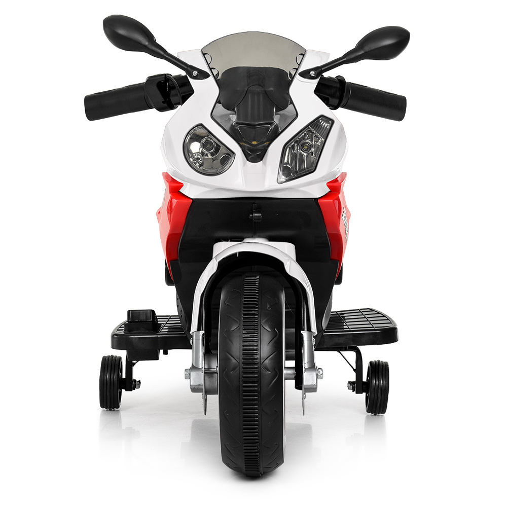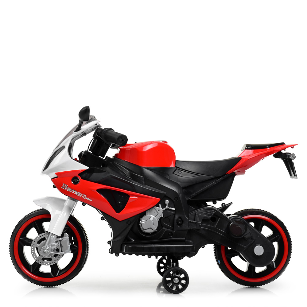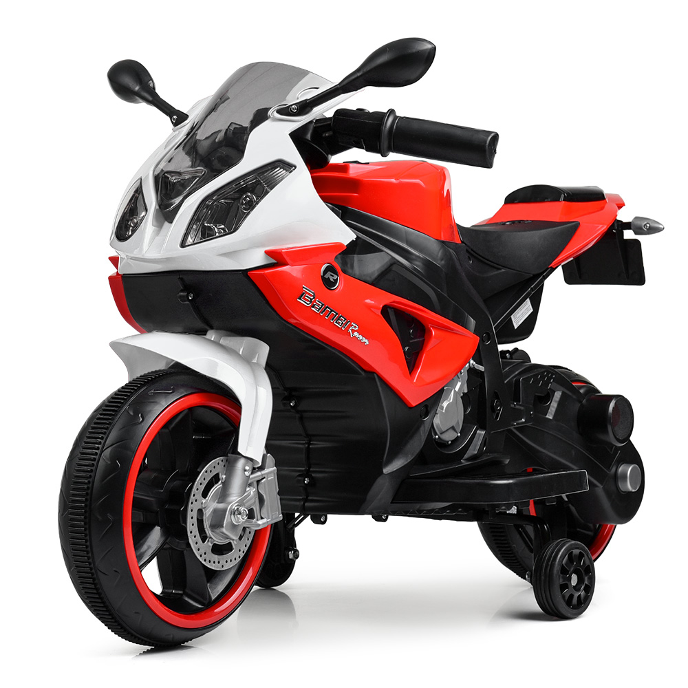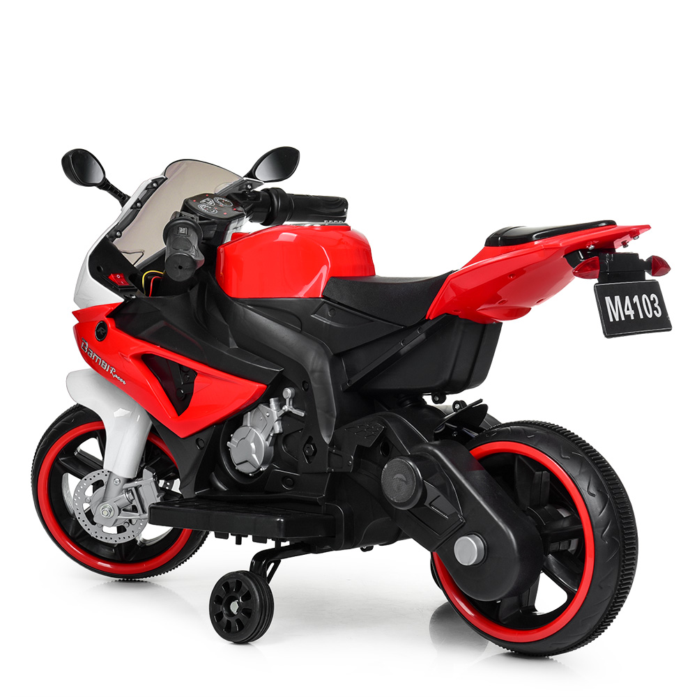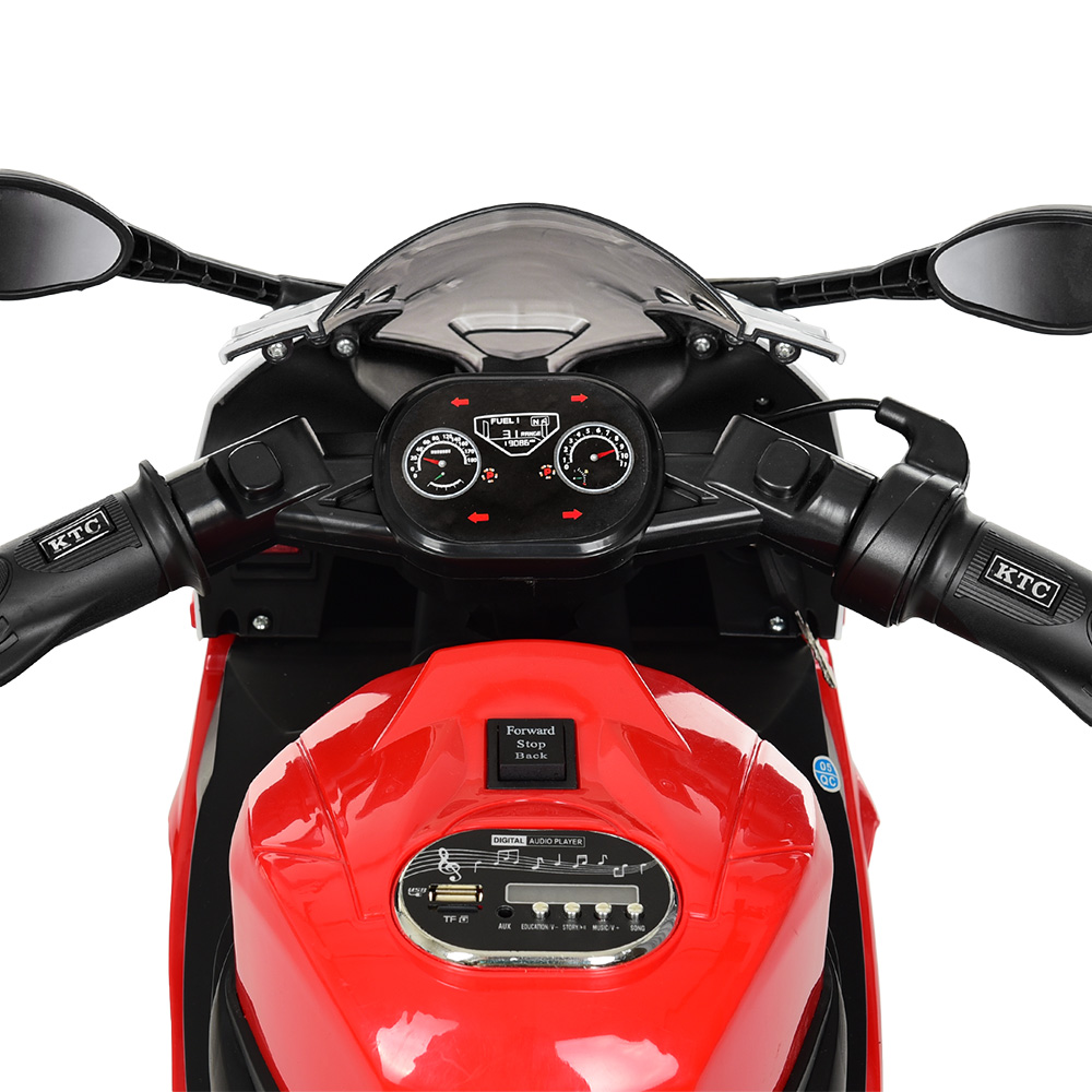 Металлический каркас двигателя (эмуляция), пластиковый корпус из каленного поли пропилена, заводится с ключа, есть музыкальная панель на батарейках, дополнительные страховочные колеса