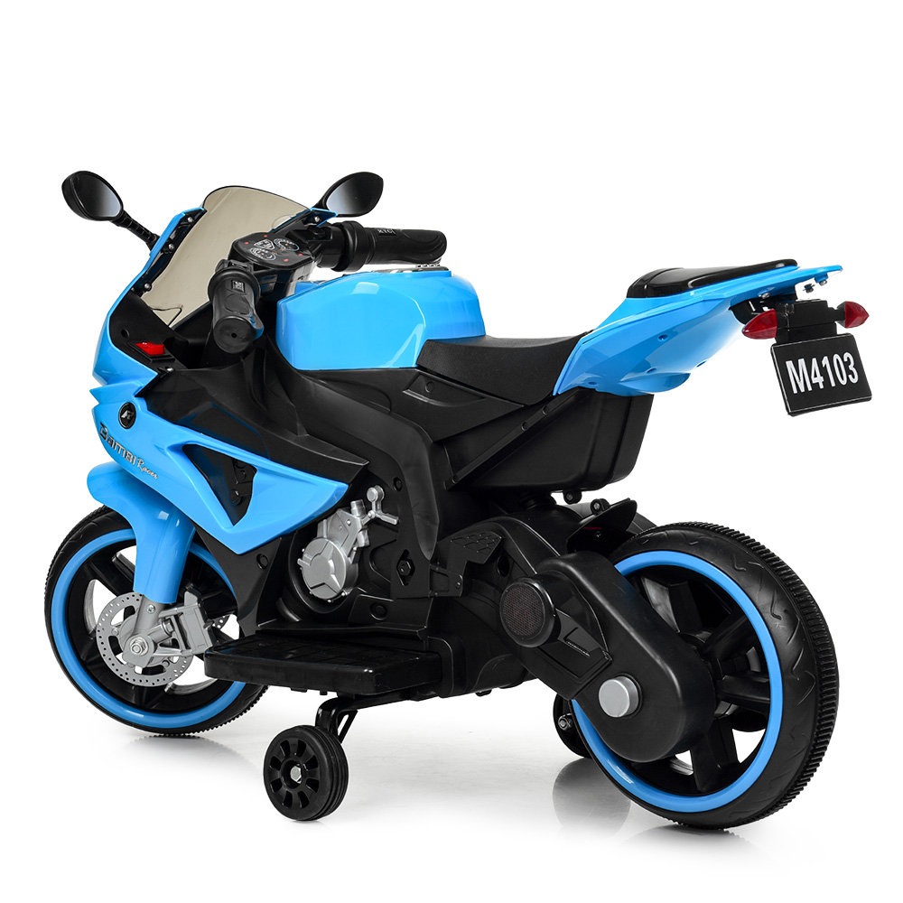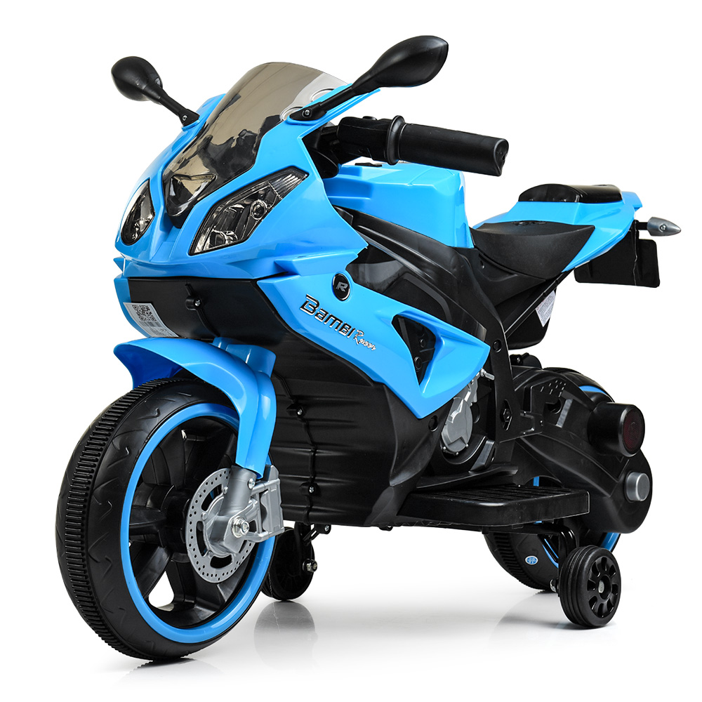Металлический каркас двигателя (эмуляция), пластиковый корпус из каленного поли пропилена, заводится с ключа, есть музыкальная панель на батарейках, дополнительные страховочные колеса