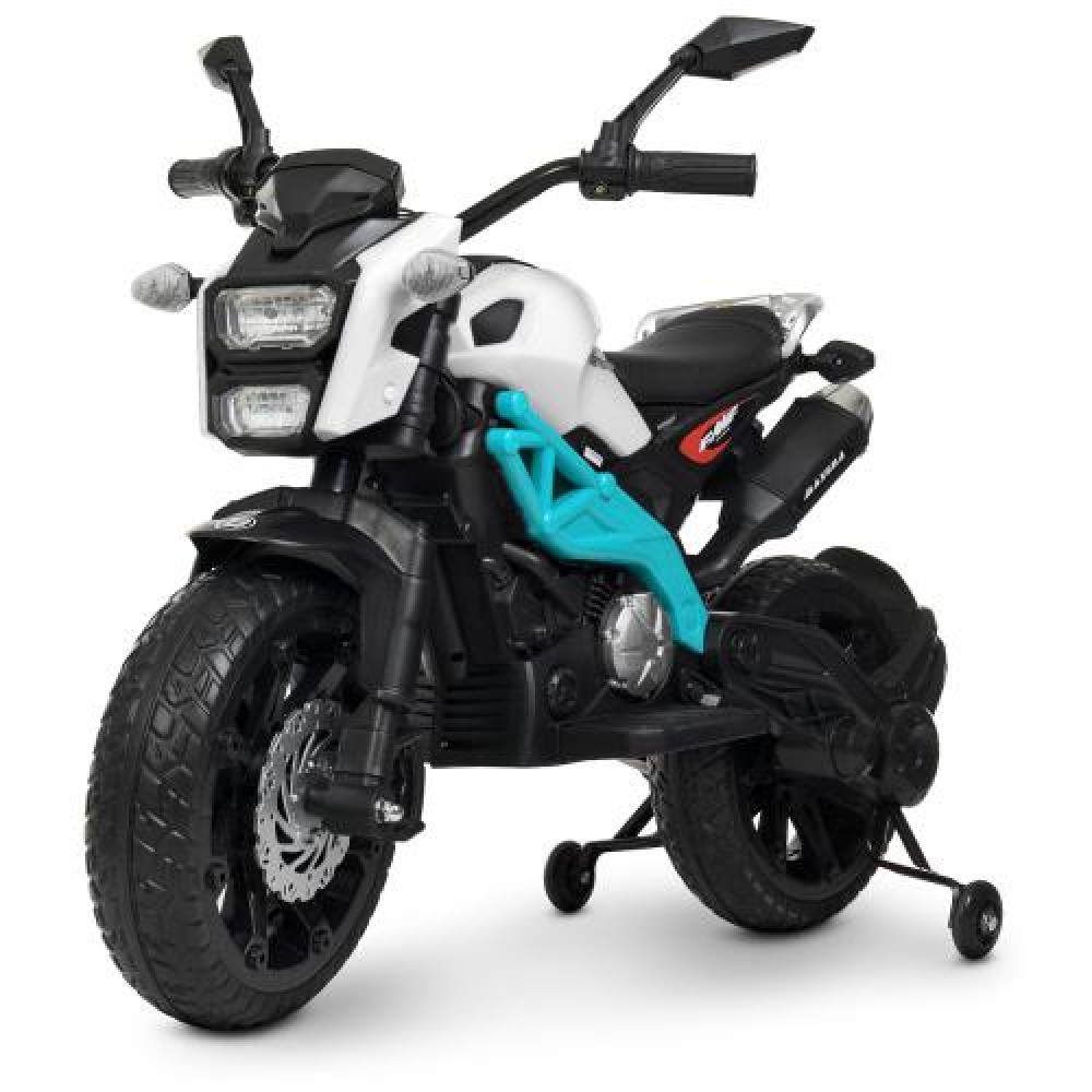 Металлический каркас двигателя (эмуляция), пластиковый корпус из каленного поли пропилена, заводится с ключа, есть музыкальная панель на батарейках, дополнительные страховочные колеса