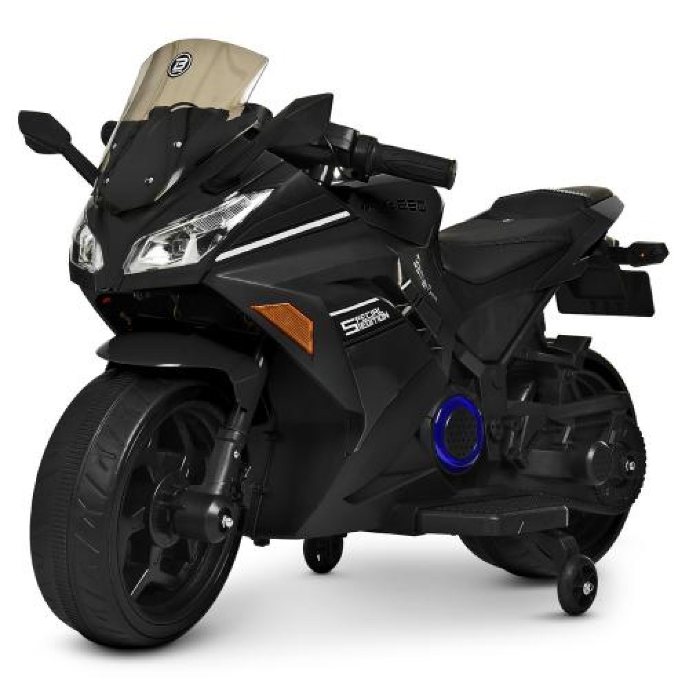 Металлический каркас двигателя (эмуляция), пластиковый корпус из каленного поли пропилена, заводится с ключа, есть музыкальная панель на батарейках, дополнительные страховочные колеса