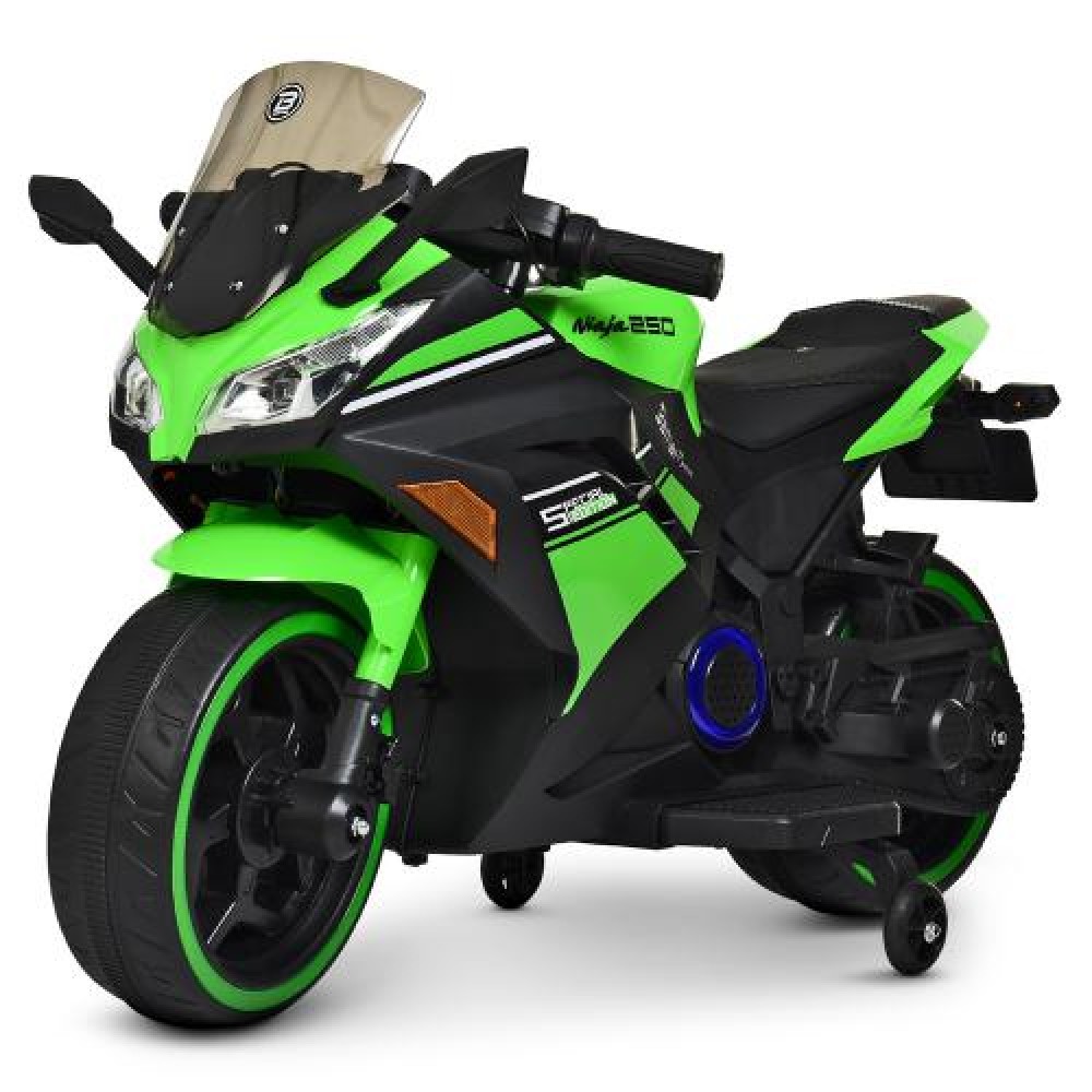 Металлический каркас двигателя (эмуляция), пластиковый корпус из каленного поли пропилена, заводится с ключа, есть музыкальная панель на батарейках, дополнительные страховочные колеса