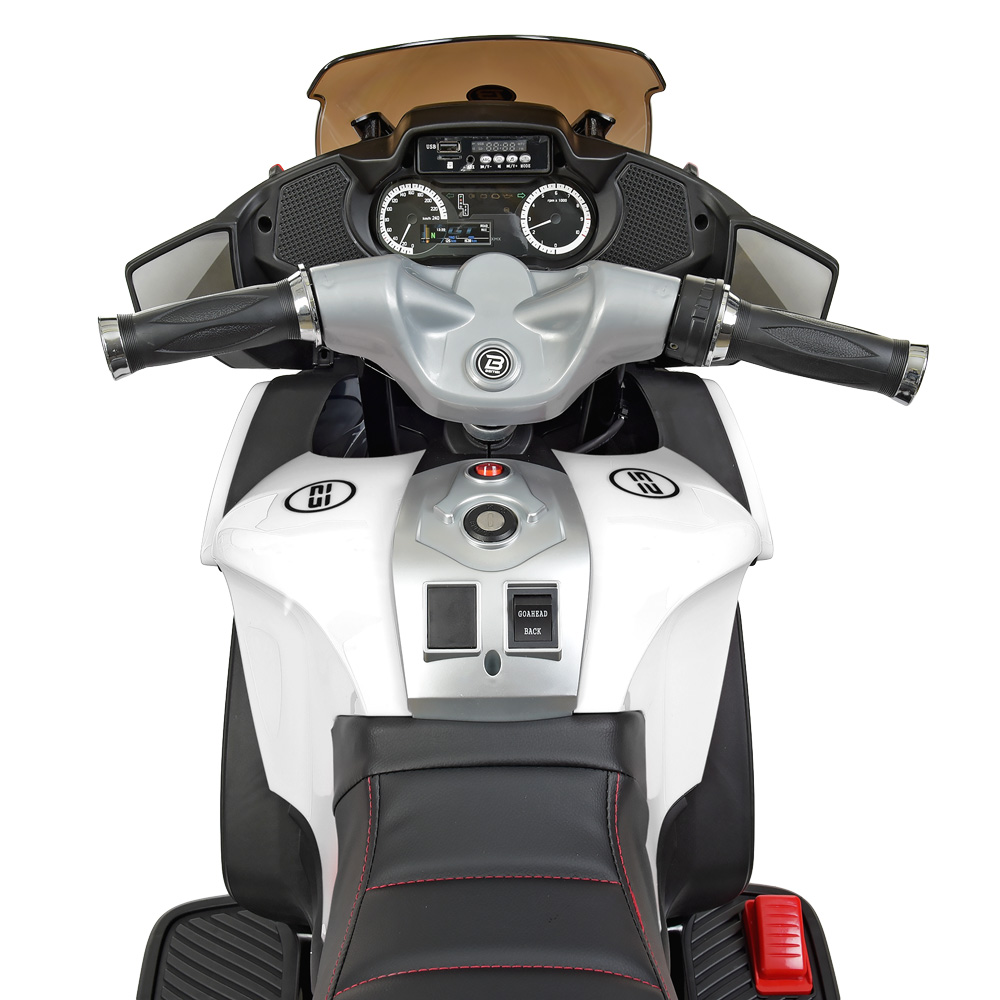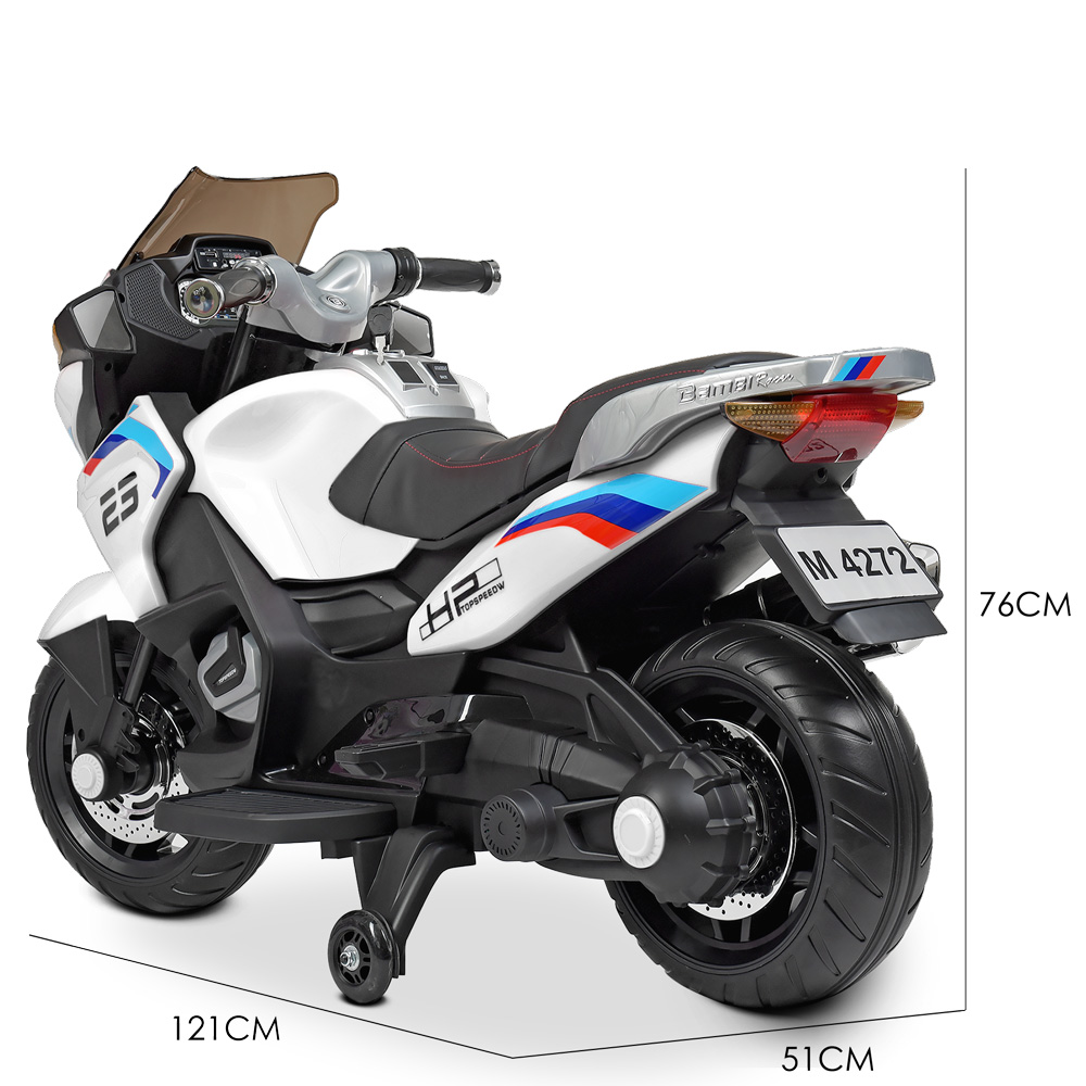 Металлический каркас двигателя, пластиковый корпус из каленного поли пропилена, заводится с ключа, есть музыкальная панель на батарейках, дополнительные страховочные колеса