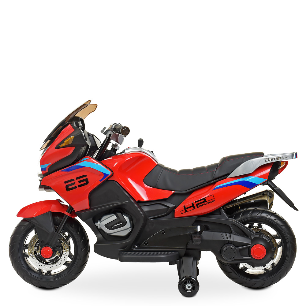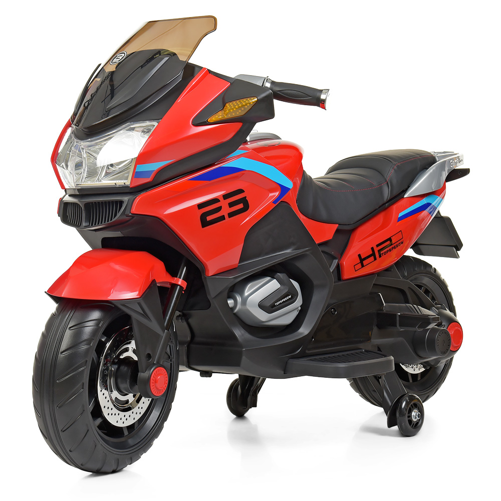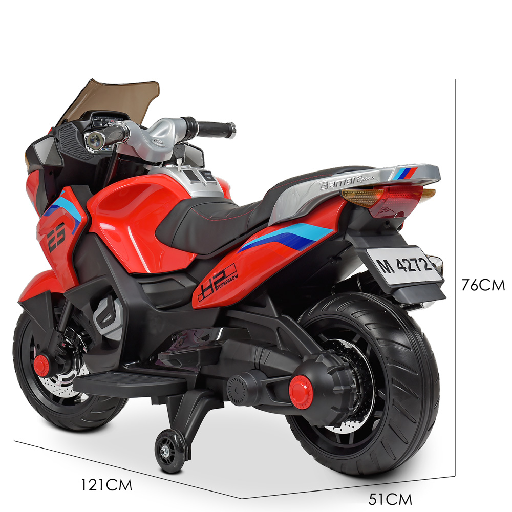 Металлический каркас двигателя, пластиковый корпус из каленного поли пропилена, заводится с ключа, есть музыкальная панель на батарейках, дополнительные страховочные колеса