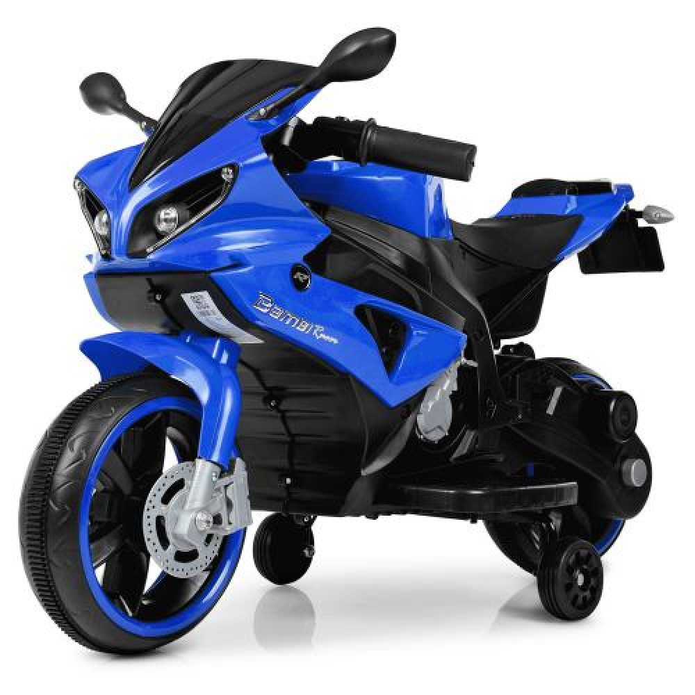 Металлический каркас двигателя (эмуляция), пластиковый корпус из каленного поли пропилена, заводится с ключа, есть музыкальная панель на батарейках, дополнительные страховочные колеса
